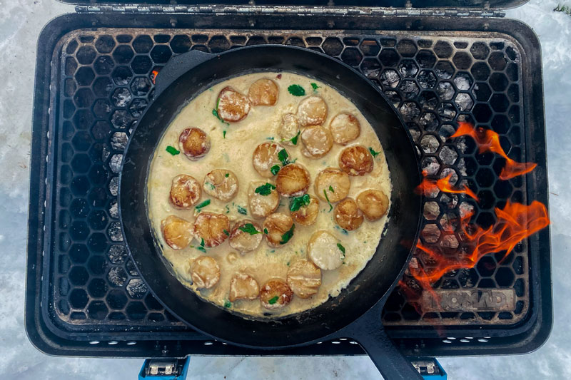 - Place a skillet on your grill grates and melt the butter with the olive oil.