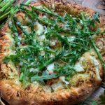 Brush the dough generously with a layer of fresh Pesto then add the Pancetta, Goat cheese Asparagus and a final layer of mozzarella cheese.